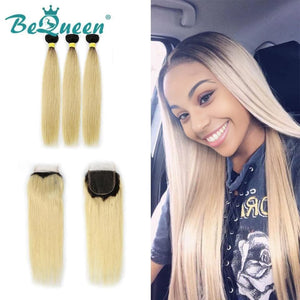 BeQueen dreiteiliges glattes Haargewebe aus 100 % reinem Haar mit Frontal in der blonden Farbe Nr. 613, schwarzer Wurzel Nr. 1B