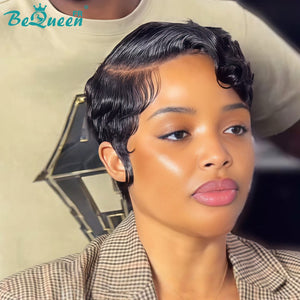 Bequeen Perücke „Chioma“ Pixie schwarz lockig ohne Kleber mit Spitzenfront Stil 4