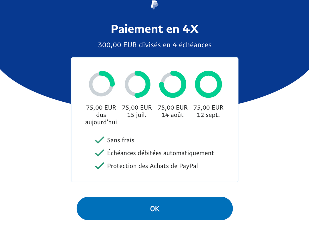 4/ Sur la page de résumé, vous pouvez voir le détail de vos échéances. Cliquez sur "OK" pour valider votre commande. Un premier paiement correspondant à 25% de l'achat est dû aujourd'hui. Les échéances suivantes seront débitées automatiquement.